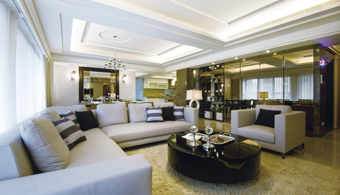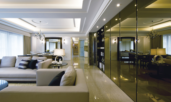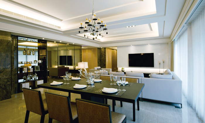 入口玄關區相當寬敞,地面特製的石材拼花,演繹家徽般的尊榮之美,過道兩側打造質感精美的鞋櫃、衣帽間,預留大容量的人性化收納,便利家人或訪客進出,另備有隱密的儲藏室,可滿足家中大型物件的收納需求,透過精巧的整合與集中管理概念,極限釋放公領域可用的活動範圍。走出玄關即進入寬敞且明亮的大客廳,大面開窗導入豐沛光感,配合流暢動線與質型俱美的傢具軟件、藝術品裝置,讓人明確感受到空間中秩序鮮明的十字軸線,特別是串連客、餐廳之間的動線旁,一長列使用大量鏡面搭配石材精工打造的連續面造型櫃,透過影像與背景光交疊的虛實趣味,讓空間流盪著迷人的繽紛光影。開放規劃的客、餐廳,兩者透過刻意簡化線條的分區天花板造型劃分屬性,廳內灰、黑、白色系為主的現代傢具、燈飾輔助界定,藉風格的一致性隱喻主人的個性品味。客廳光潔溫潤的主牆選用白色天然石材打造,細膩的紋理結合下方內退光帶,增加層次變化與穿透感。氣勢沈穩的餐廳多半用來接待賓客,自家人的餐敘多半集中在設備完善的中島餐廚區,天頂配置照度柔和的流明天花板,牆面統一貼覆大理石,勾勒閒逸自得的生活感,尤其是男主人,最愛在餐檯邊一邊看報、看電視,一邊與伴侶閒聊、享受美味餐點,作為一天活力的開始。