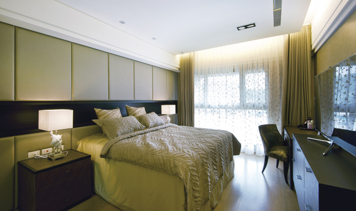 情境優雅的主臥室用色沈穩、溫馨,刻意減少裝飾性的干擾,好讓主人能獲得更充分的休息,簡潔的床頭牆面以等比分割的繃布造型整合上下比例,中央內退的展示格採深色木料處理,勾勒安定的立面層次,床尾安排閱讀區與視聽櫃,床側空間一分為二,一半設置井然有序的洗浴設備,後半段則是更衣間,讓空間坪效獲得最佳化的運用。欣賞此案,第一眼會為其中的精緻細節深深觸動,但在視覺與觸覺的驚艷之後,更能體會設計者灌注其中的周密與體貼。