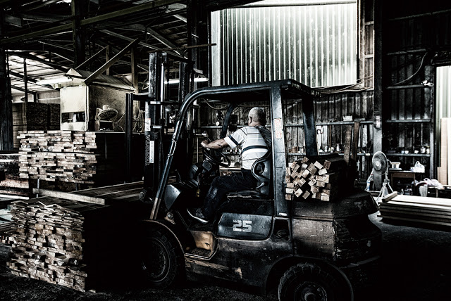 鋸台不斷運轉、空壓機運作發出轟隆隆的聲音,高分貝的噪音恍如一首不受年輕世代喜愛的歌曲、紛飛的木屑不一會兒時間就將人包圍成了木屑人,在製材業工資以天計算,一天最少1500元,最多可達2700元,看似優渥的薪水卻仍門可羅雀,「你沒看到都是老員工在工作,這些員工都是40年以上的,大多從小就開始做學徒了。」冬天還好些,夏天的酷熱是宛如試煉場般難耐。