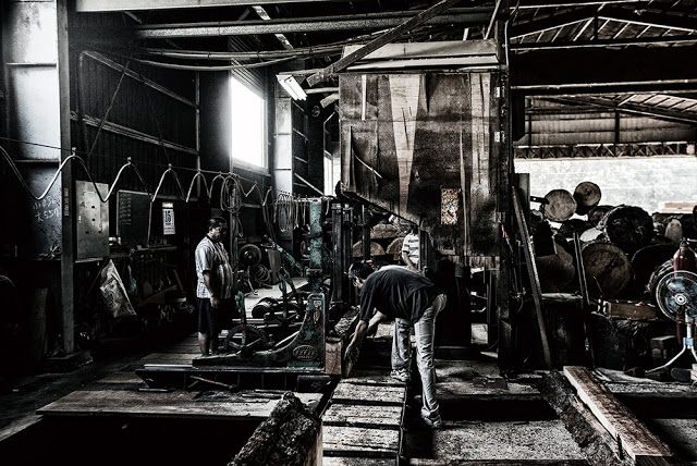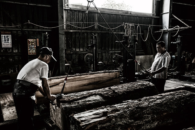 滿載原木的貨車進進出出,大型機具吊起木頭,若平衡沒有控制得宜,就有可能發生「人還沒跑下來,木頭就跑下來了」的危險情況,耳聞過不少驚悚意外,吳老闆說:「我們現在都很注意安全,要盡量平均木頭重量,不能上下傾斜,畢竟這一傷到可能都沒得救。」環顧四方,製木好漢彼此間話不多,每個人全心專注在手上的工作。