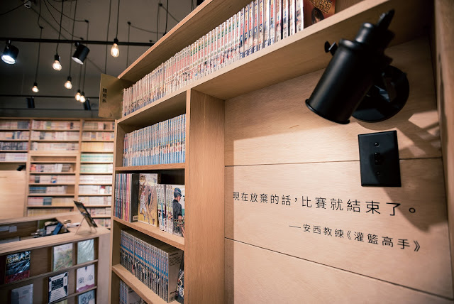 木製的書牆上布滿漫畫經典台詞,像是灌籃高手中安西教練的話:「現在就放棄的話,比賽就結束了。」這句話正是李昆霖人生真實的寫照,在經營學的比賽中征戰,充滿挑戰性的人生。「很多人會說現在人不太看紙本了,那是不是很難去經營這間店?但商場上有一句話說得很好,門檻愈高,