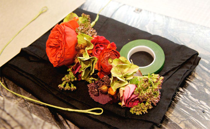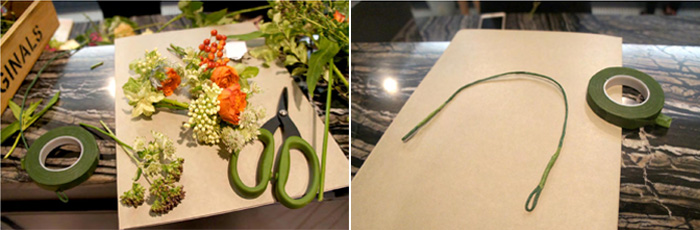 步驟:1. 用粗鐵絲量度頭環大小,剪去多餘部分後用綠膠紙綑邊,留下兩個入絲帶用的圈圈。導師提醒我們,太多鐵絲便需要更多的花,導致頭環過重,而太短又會不夠美觀;同時間,因為花會綁於圈上面,也要注意鐵圈製成花環後會「縮水」一點,因此要預留位置。2. 選擇喜愛的花,剪上合適的長度,去掉底下的花葉,然後以幼鐵絲把每小束花綑好。導師會指導大家每束花需要預留的花莖長度,或每束會否太多或太少,像是編輯就把每束綑得太少了,花點了時間去掌握所需份量。由於花束是打橫綁在鐵圈上的,所以每束花不要做得太像花球,最好是打橫也能觀賞,導師在途中便為我們指導調整。