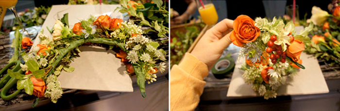 3. 把每小束花用綠膠紙以同一方向綑在鐵圈上,導師教大家感受使用綠膠紙的力度,要怎樣才能拉出黏度而不扯斷它。同時,要記得花要打橫成弧度的綑上,不然頭環造出來便不夠圓。4. 鐵圈都綑滿花束之後,便要檢查是否有明顯可見鐵圈的地方,慢慢補上花葉。最後圈上絲帶即成。