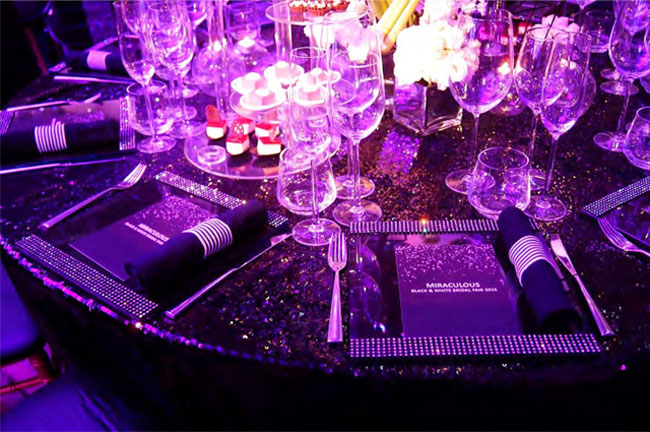以 Miraculous Black & White 顛覆對黑白婚禮的觀感炫目夢幻的星光地毯、鑲滿晶石的絨面椅套、銀閃的餐具配上純白的桌飾,矚目效果顛覆大家對於黑白色調婚宴的想像,摒棄「黑白就是不符合傳統」的觀念。獨愛隱約閃耀的桌布,就像在星河之上享用佳餚一樣!